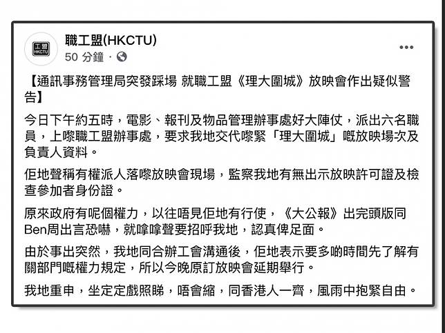 æ¦æ¼¢èºç è·å·¥çæ¹æç«åºé' ç¶æ"å·¥ä»"éæ ä¿æ"¿åºä¿éå±å"¡æ¬ç ç¨åª'å ±å° ç¨ç«åª'é«" from www.inmediahk.net ️行業分流 ️ 地盤工會: @cswgu 香港酒店工會: @aleminem @umdgr 飲食業: @chiegu 交通運輸業︰ @lictdu 物業管理: @hkbmswgupm 文化藝術、音樂自僱: @z02223 美容化妝: @z02223 家居服務. 職工盟(hkctu) tg: @hkctu 勞工權益、傳媒聯絡:27708668 五大訴求,缺一不可! 職工盟(hkctu), yau ma tei, hong kong. 成立於 1990 年 7 月,至今已有 93 個屬會,代表超過 19 萬名會員。職工盟是一個完全自主的工會聯合組織,不依附權勢,獨立於任何政權、財團。 職工盟在七月一日主權移交之日將會舉行全港街站,「疫政」當前,武官當道,防疫與公民社會發聲必須繼續存在。 街站將嚴格遵守防疫規例,然而公民社會亦必需在七一繼續發聲。 銅鑼灣街站:(各街站將分佈不同地方) 職工盟 香港白領 行政及文職 同行工會 3972 5242 / 2770 8668 傳真: